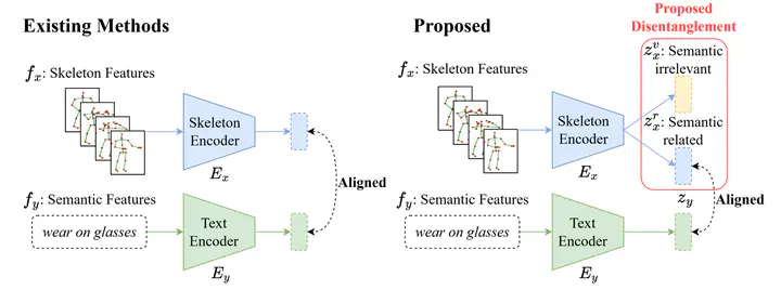 Existing zero-shot skeleton-based action recognition methods utilize projection networks to learn a shared latent space of skeleton features and semantic embeddings. The inherent imbalance in action recognition datasets, characterized by variable skeleton sequences yet constant class labels, presents significant challenges for alignment. To address the imbalance, we propose SA-DVAE—Semantic Alignment via Disentangled Variational Autoencoders, a method that first adopts feature disentanglement to separate skeleton features into two independent parts—one is semantic-related and another is irrelevant—to better align skeleton and semantic features. We implement this idea via a pair of modality-specific variational autoencoders coupled with a total correction penalty. We conduct experiments on three benchmark datasets: NTU RGB+D, NTU RGB+D 120 and PKU-MMD, and our experimental results show that SA-DAVE produces improved performance over existing methods. The code is available at https://github.com/pha123661/SA-DVAE.